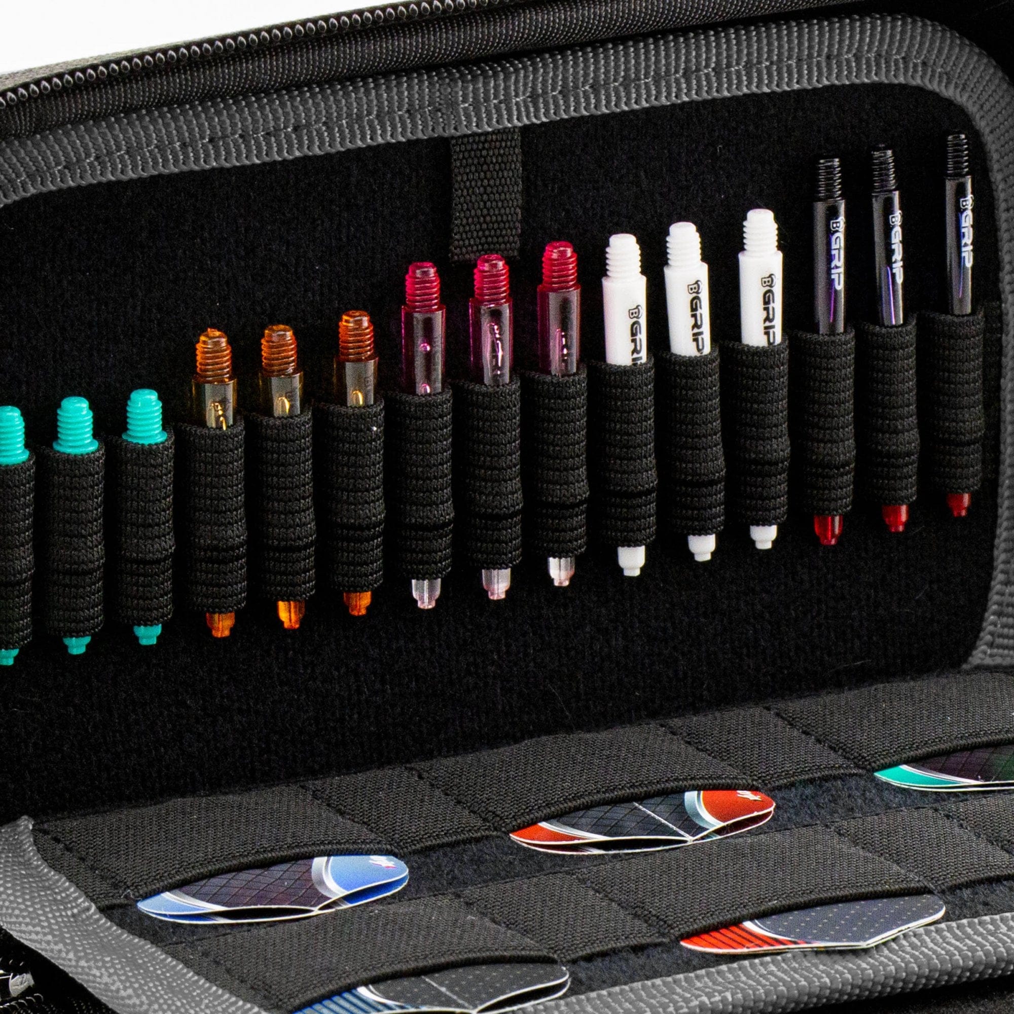 BULL'S Orbis Eagle Camoflage EVA XL Dart Case. XL Dimensions: 190 x 110 x 50mm and includes a foam holder for two complete dart sets, as well as two inner sides for 12 sets of flights. One side has holders for 15 shafts and the other side has a closable mesh pocket forsoft tips & accessories.