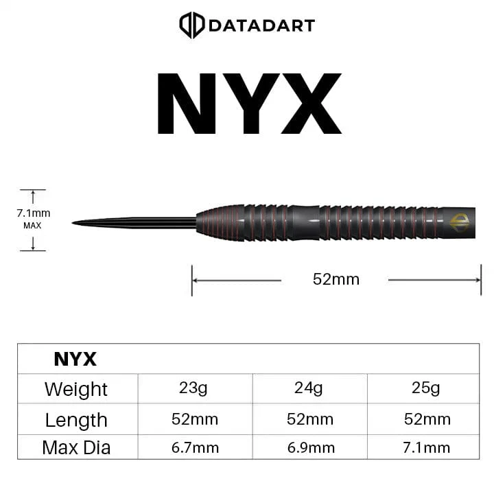 Datadart NYX Darts - Steel Tip - 90% Tungsten - 25g. The Nyx features two styles of cuts: radial grooves to the front nose and a shark-cut grip along the barrel. The contoured middle section ensures precise finger placement for ultimate control. The barrel tapers from front to back, finished in a sleek black PVD coating with deep red radial infills and laser-etched accents, delivering a bold, stealthy look.