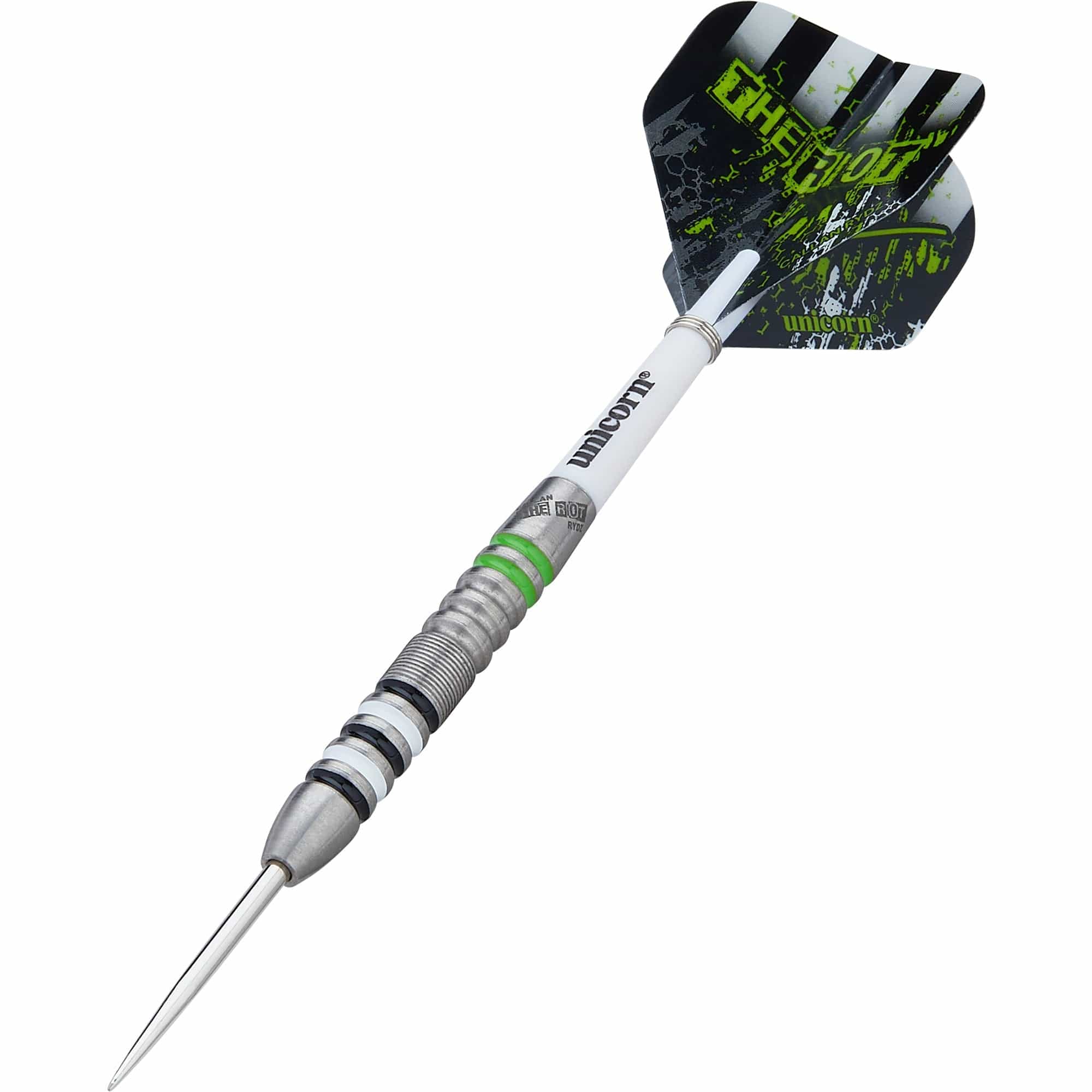 Unicorn Callan Rydz Darts - Steel Tip - The Riot - 21g. Each set of these Callan Rydz 80% tungsten darts feature a ringed barrel with come mixed coloured rings including green, black and white. This ringed barrel contains a natural section at the rear which includes The Riots lasered logo. They include some ultrafly flights and gripper shafts.